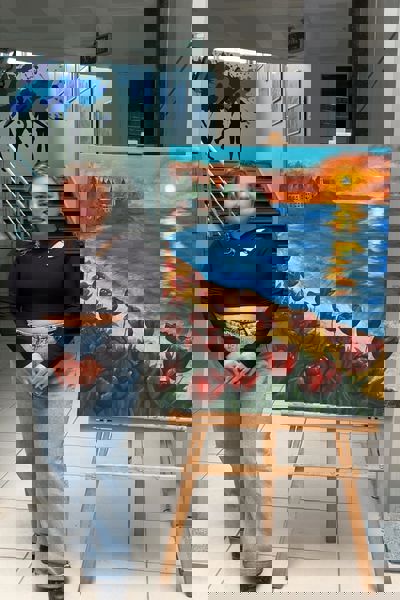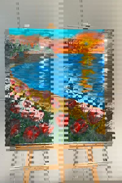 Renk paletinde ise sıcak ve soğuk tonların dengeli birlikteliği göze çarpıyor. Gökyüzündeki turuncu ve sarı tonlar, kıyıdaki koyu yeşil ve mor tonlarla kontrast oluştururken; kırmızı laleler ve derin mavi deniz arasında kurulan denge esere duygusal bir derinlik kazandırıyor.